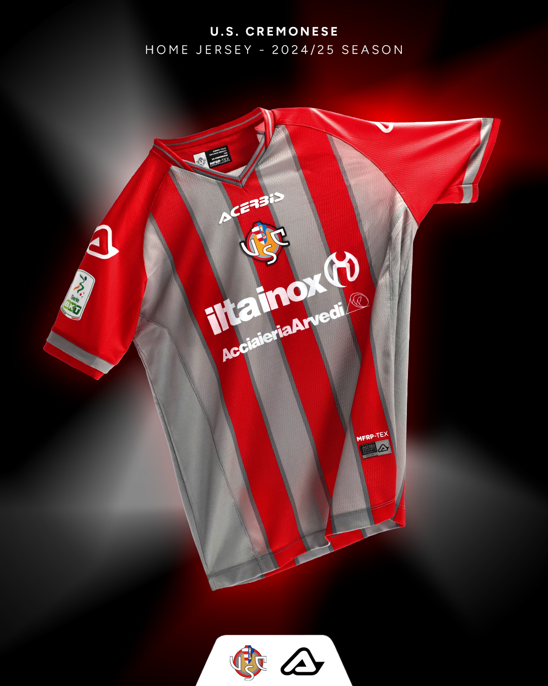 “Amore, passione e identità. La Cremonese è lieta di annunciare la maglia home per la stagione sportiva 2024-25, realizzata per il sesto anno consecutivo dallo sponsor tecnico Acerbis. Caratterizzata da tagli simmetrici diagonali all’interno dei quali si inseriscono le tre linee verticali alternate grigio-rosse, la maglia home vede anche il ritorno del logo in posizione centrale.